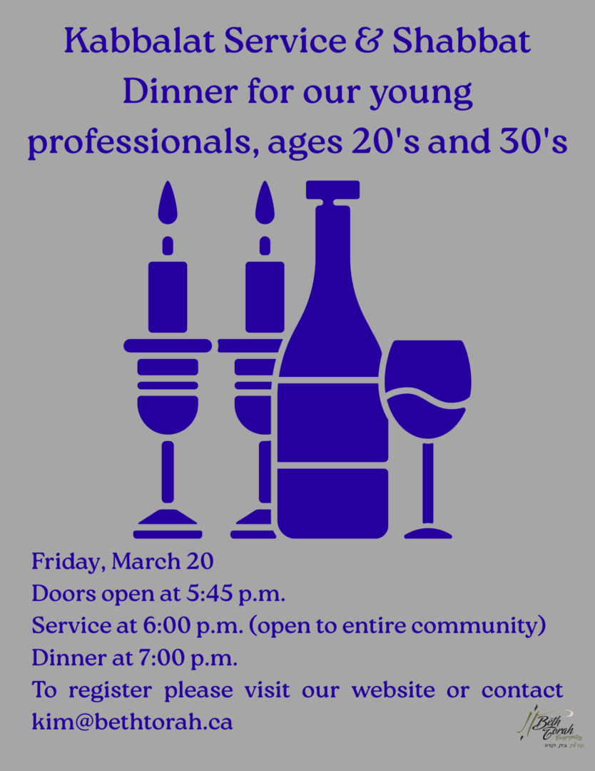 Calling all young professionals in your 20's and 30's! Grab your friends and join us on Friday, March 20 for a meaningful Kabbalat Shabbat service, followed by a traditional Shabbat dinner. Come for the spirit, stay for the community, food, and great conversation. To register click here