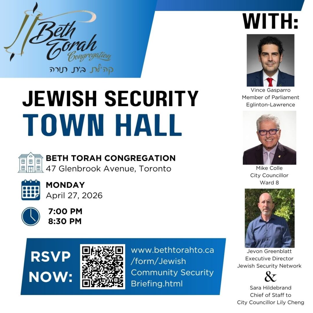 Join us on Monday, April 27 @ 7:00 p.m. - Beth Torah will host a Jewish Community Security Briefing with representation from all levels of government and the Jewish Security Network. Space is limited, and registration is required. Join us for an open discussion on the state of Jewish security in the GTA. We invite you to hear what's […] |
