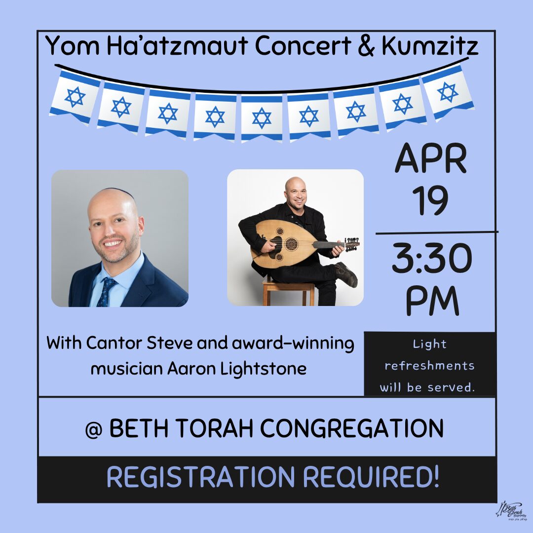 Please join us for a special Yom Ha'atzmaut & Kumzitz afternoon on Sunday, April 19 @ 3:30 p.m. Through the timeless melodies of Naomi Shemer, alongside contemporary voices such as Ishay Ribo, we will journey through the musical landscape of Israel—past and present. Together, we will celebrate the resilience of the Israeli people and offer […] |